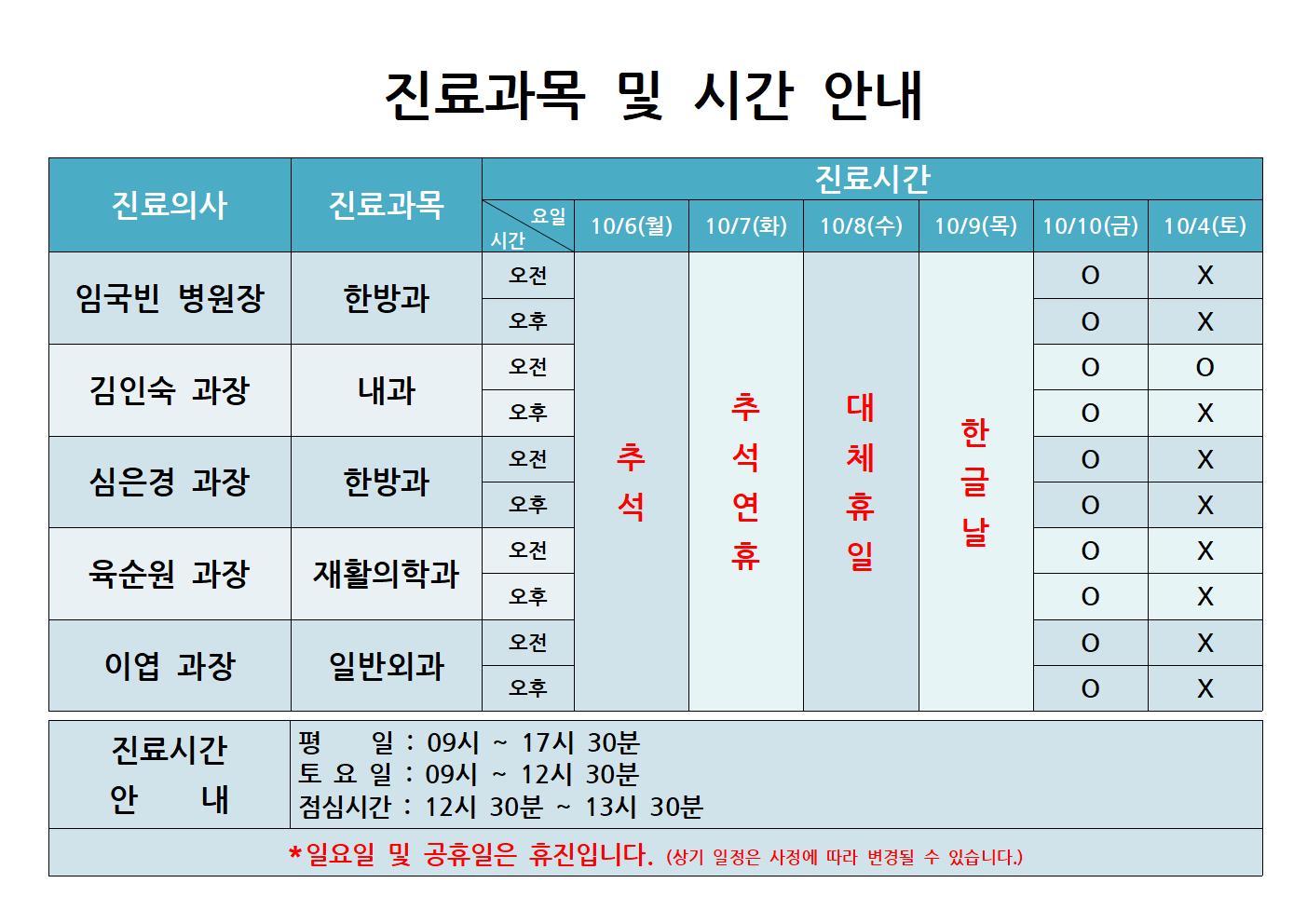 - 일요일 및 공휴일(10/6~10/9 추석연휴, 대체휴일, 한글날)은 휴진입니다.