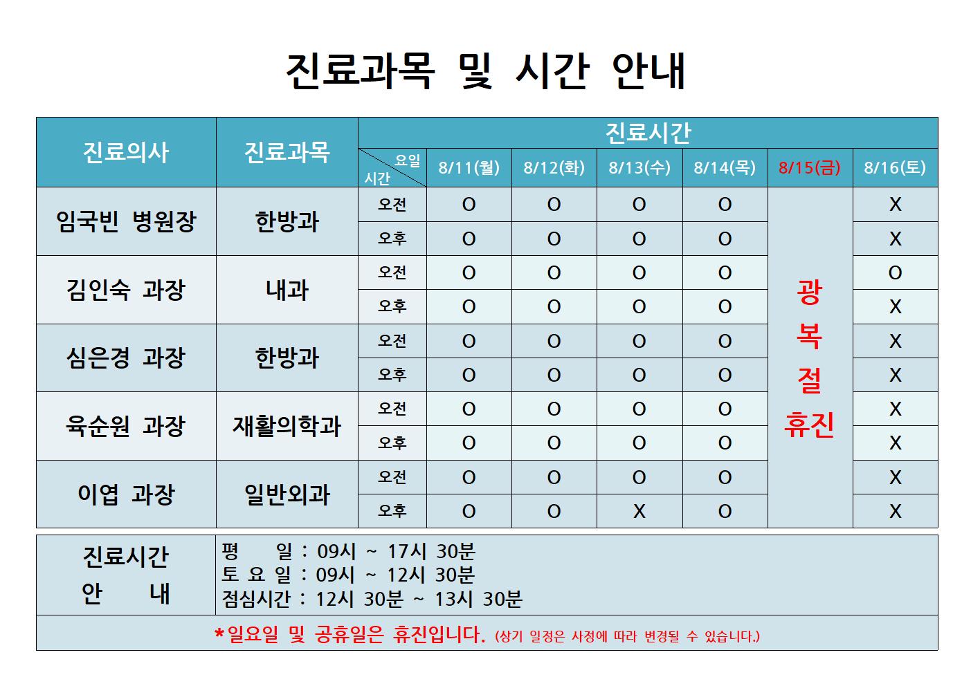 - 일요일 및 공휴일(8/15 광복절)은 휴진입니다.